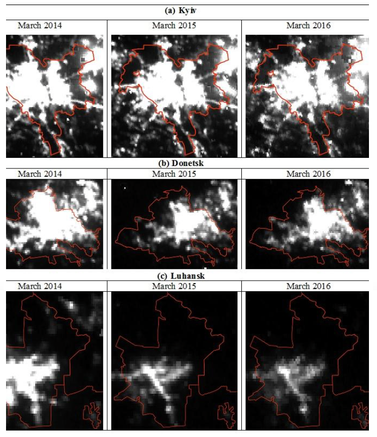 На зображеннях Донецька і Луганська видно, що за рік значно зменшилися як площа освітленості, так і її інтенсивність. У Києві зміни дуже несуттєві.