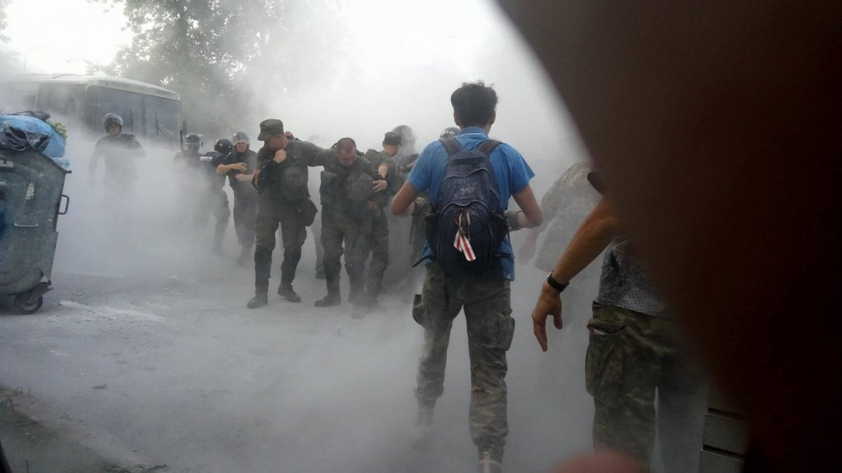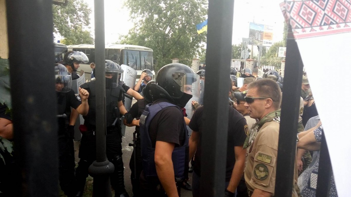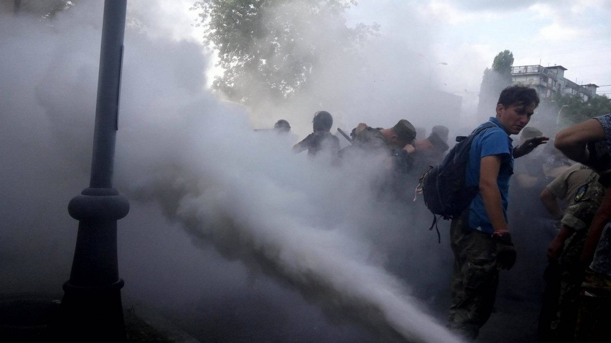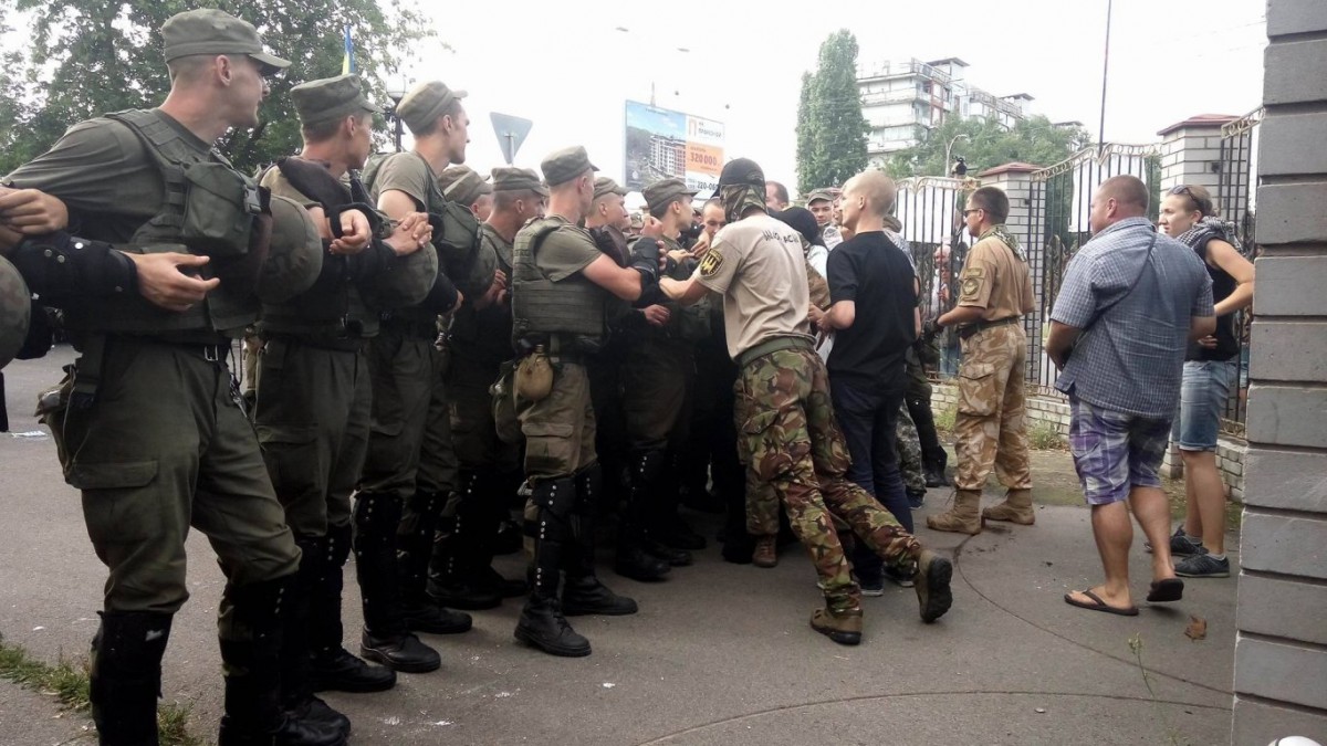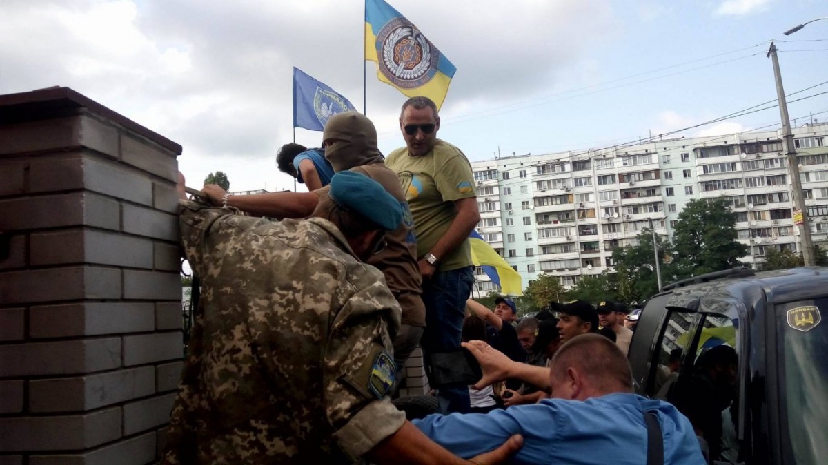 Также представители добровольческих батальонов пытались перелезть через забор суда, чтобы попасть в суд, но у них это не получилось. Добровольцев сейчас стало больше, они продолжают провоцировать полицейских, но полицейские стоят на своих позициях, и не пропускают их в суд.