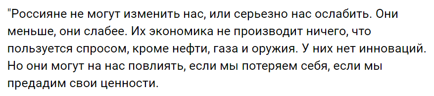 Обама отметил, что россияне меньше и слабее Америки. Он подчеркнул хрупкость и несостоятельность российской экономики, которае не может создать инноваций, а только лишь торгует нефтью и газом.