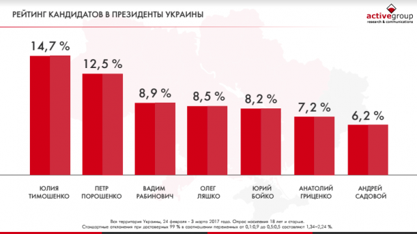 В ходе исследования респондентам предлагали ответить на вопрос: «За кого бы вы голосовали, если бы выборы президента Украины проходили в середине марта?» Так, первой в рейтинге оказалась Юлия Тимошенко, которой отдали предпочтение 14,7% опрошенных. Второе место занял Петр Порошенко (12,5%), а третье – Вадим Рабинович (8,9%). Четвертое и пятое места получили Олег Ляшко (8,5%) и Юрий Бойко (8,2%).