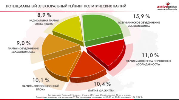 Согласно опросу, большинство избирателей отдали бы свои голоса за Всеукраинское объединение «Батькивщина» (15,9% респондентов). Второе место, как и в президентском рейтинге, занимает «Блок Петра Порошенко “Солидарность”» (11,0%). Партия «За життя» (10,4%) и «Оппозиционный блок» (10,1%) заняли третье и четвертое места соответственно.