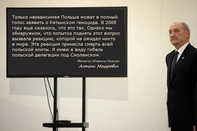 Министр обороны Польши Антони Мацеревич заявил, что Катынское преступление и Смоленская катастрофа в контексте современных конфликтов были актами терроризма против Польши.