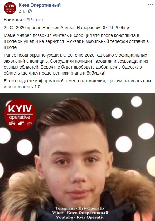 Ранее неоднократно уходил. С 2018 по 2020 год было 9 официальных заявлений в полицию. Сотрудники полиции находили и возвращали из разных областей. Вероятно будет пробовать добраться в Одесскую область где живут родственники (папа и бабушка)
